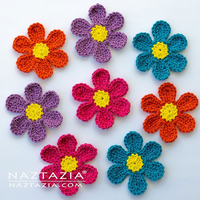 This crochet flower power blossom is easy to make. There are three rounds to the pattern. The first consists of double crochet stitches, while the second and third rounds form the petals. This sample used worsted weight yarn with a 4 mm hook. Feel free to size up or down with the yarn and hook to create larger or smaller flowers.